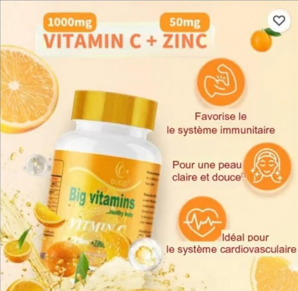Vitamine C + Zinc, compléments alimentaires permettent d’apporter un supplément en parallèle d’une alimentation variée et équilibrée. La vitamine C contribue au fonctionnement normal du système immunitaire. Le Zinc contribue à protéger les cellules contre le stress oxydatif.